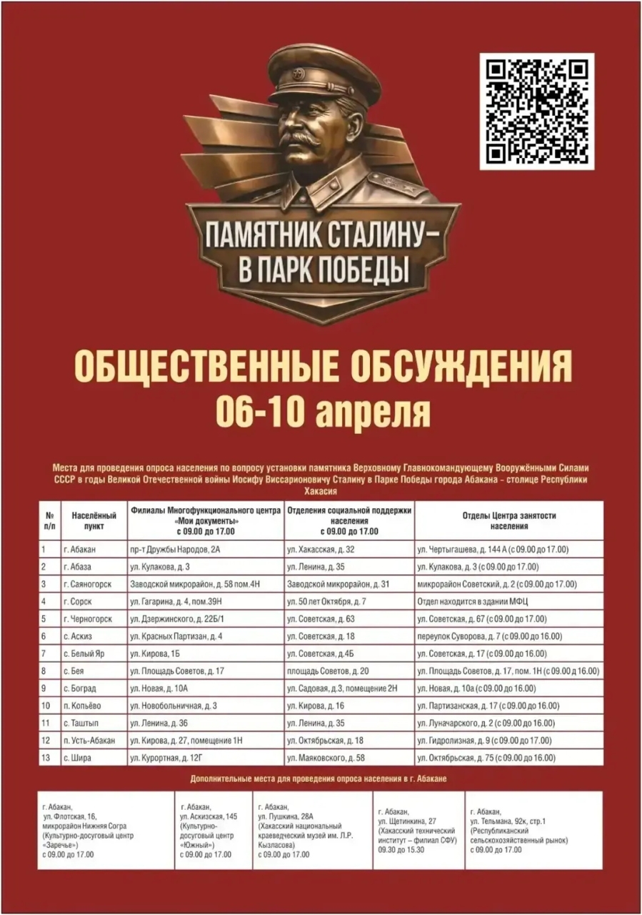 🔶А также, если вы поддерживаете инициативу Хакасского регионального отделения Общероссийской общественной организации «Дети войны» по вопросу установки памятника Верховному Главнокомандующему Вооружёнными Силами СССР в годы Великой Отечественной войны Иосифу Виссарионовичу Сталину в Парке Победы города Абакана – столице Республики Хакасия, то у вас появляется возможность с 6 по 10 апреля оставить свой голос в бюллетене для голосования.